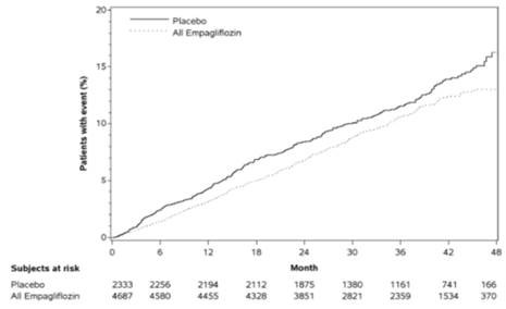 이중 눈가림, 위약 대조 시험인 EMPA‑REG OUTCOME 임상시험에서 확인된 죽상동맥경화성 심혈관계 질환이 있는 제 2 형 당뇨 환자에서 표준 치료에 추가 투여한 엠파글리플로진(10 mg 및 25 mg 용량을 통합)과 위약을 비교하였다. 총 7,020명의 환자(엠파글리플로진 10 mg: 2,345명, 엠파글리플로진 25 mg: 2,342명, 위약: 2,333명)가 투여 받았고 3.1년(중앙값) 동안 추적되었다. 평균 연령은 63세, 평균 HbA1c는 8.1%이었고, 71.5%가 남성이었다. 베이스라인에서 메트포르민 투여 환자는 전체 환자의 74%, 인슐린 투여 환자는 48%, 설포닐우레아 투여 환자는 43%이었다. 사구체 여과율(eGFR)이 60‑90 ml/min/1.73 m2인 환자는 52.2%, 45‑60 ml/min/1.73 m2 환자는 17.8%, 30‑45 ml/min/1.73 m2 환자는 7.7%이었다.