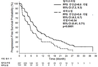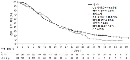 * PFS, ORR 및 반응기간은 2017년 9월 15일 데이터마감일(cut ‑off date)과 이 약 투여군에서 13.0개월 (95% CI: 11.1, 18.4) 및 화학요법군에서 7.2개월(95% CI: 4.6, 11.1)의 PFS에대한 추적관찰 중앙값 기준으로 한다. OS는 2019년 9월 30일 데이터마감일(cut ‑off date) 기준이며, 이 약 투여군에서 44.9개월(95% CI: 37.9, 47.0) 및 화학요법군에서 36.8개월(95% CI: 34.3, 43.0)을 추적 관찰 중앙값에 기반하였다.