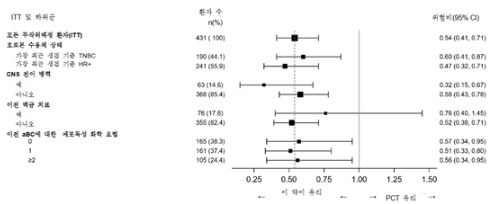 a. 위험비는 각 치료를 유일한 공변량으로 하는 층화된 콕스 회기 모델(Cox regression model)에 기반하였고(층화 요인: 이전 화학요법 횟수, 3중 ‑음성 상태, 중추신경계 전이 병력), 전반적으로 이 약을 선호하는 1회 미만의 화학요법과 비례한다.