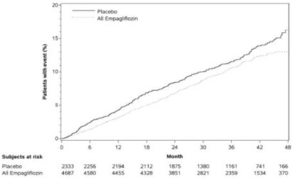 이중눈가림, 위약 대조 시험인 EMPA ‑REG OUTCOME 임상시험에서 확인된 죽상동맥경화성 심혈관계 질환이 있는 제 2형 당뇨 환자에서 표준 치료에 추가 투여한 엠파글리플로진(10 mg 및 25 mg 용량을 통합)과 위약을 비교하였다. 총 7,020명의 환자(엠파글리플로진 10 mg: 2,345명, 엠파글리플로진 25 mg: 2,342명, 위약: 2,333명)가 투여 받았고 3.1년(중앙값) 동안 추적되었다. 평균 연령은 63세, 평균 HbA1c는 8.1%이었고, 71.5%가 남성이었다. 베이스라인에서 메트포르민 투여 환자는 전체 환자의 74%, 인슐린 투여 환자는 48%, 설포닐우레아 투여 환자는 43%이었다. 사구체 여과율(eGFR)이 60 ‑90 ml/min/1.73 m2인 환자는 52.2%, 45 ‑60 ml/min/1.73 m2 환자는 17.8%, 30 ‑45 ml/min/1.73 m2 환자는 7.7%이었다.