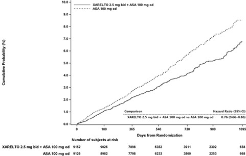 일차 유효성 분석(예, 모든 원인에 의한 사망, 심근경색 또는 뇌졸중의 복합)에서 리바록사반 2.5 mg 1일2회 치료군과 위약군 사이에 통계적으로 유의한 차이가 없었다. (HR=0.94;95% CI: 0.84;1.05; p=0.270). 모든 원인에 의한 사망(all‑cause mortality)의 경우, 리바록사반과 위약 사이에 차이가 없었다(100환자‑년 당 사건 발생률; 11.41 대 11.63, HR: 0.98;95% CI: 0.87;1.10; p=0.743). 심근경색의 경우 100환자‑년 당 사건 발생률(리바록사반 대 위약)은 2.08 대 2.52였고(HR 0.83; 95% CI: 0.63;1.08; p=0.165), 뇌졸중의 경우 100환자‑년 당 사건 발생률은 1.08 대 1.62였다(HR: 0.66; 95% CI: 0.47;0.95; p=0.023). 주요 안전성 결과변수(예, 치명적인 출혈 또는 영구적인 장애 가능성이 있는 위험 공간으로의 출혈의 복합)는 각각 리바록사반 2.5 mg 1일 2회 치료군의 환자 18명(0.7%) 및 위약 군의 환자 23명(0.9%)에서 발생했다(HR=0.80; 95% CI 0.43;1.49; p=0.484). 리바록사반군에서 위약과 비교해 ISTH(International Society of Thrombosis and Haemostasis) 정의에 따른 주요 출혈의 통계적으로 유의한 증가가 있었다. (100환자‑년 당 사건 발생률: 2.04 대 1.21, HR 1.68; 95% CI: 1.18;2.39; p=0.003), 전체적으로, COMMANDER HF 시험의 안전성 및 유효성 결과는 전체 COMPASS 군의 결과와 일치했다. (’12. 임상시험 정보’항 참고)