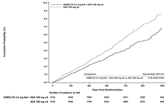 관상 동맥 질환(CAD) 또는 말초 동맥 질환(PAD) 환자에서 아스피린과 병용 시 죽상동맥혈전성 사건의 위험 감소 |