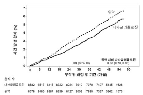 다파글리플로진 10mg은 일차 복합 평가변수인 심부전으로 인한 입원 또는 심혈관계 질환 사망의 예방에 대해 위약 대비 우월한 효과를 나타냈다 (그림 1).