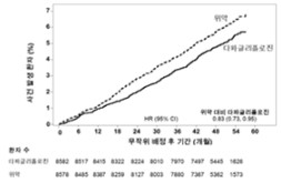 ◦ 가장 최근의 실험실적 측정으로부터 혈청 크레아티닌이 배가하는 것의 발생률(신장 기능의 급성 악화에 대한 평가)은 위약군 대비 다파글리플로진군에서 감소하였다(HR 0.68[95% CI 0.49, 0.94], 명목상의 p=0.0187).