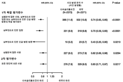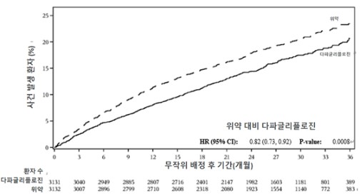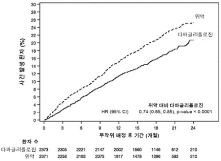 다파글리플로진은 일차 복합평가변수에 대한 발생률을 당뇨가 있는 환자에서 HR 0.75 [95% CI 0.63, 0.90], 당뇨가 없는 환자에서 HR 0.73 [95% CI 0.60, 0.88]로 감소시켰다.