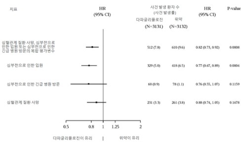 또한 심부전 병용 치료법, 신장 기능 (eGFR), 연령, 성별 및 지역 등 주요 하위군에 걸쳐 일차 평가변수에 대한 위약 대비 다파글리플로진의 치료 유익성이 일관되게 나타났다.