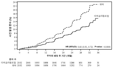환자 총 4,304명이 1일1회 다파글리플로진 10mg (N=2,152) 또는 위약 (N=2,152)에 무작위 배정되었고 28.5개월의 중앙값 동안 추적되었다. 치료는 해당 시험 동안 eGFR이 25mL/min/1.73m2이하로 감소한 경우에도 지속하였다.