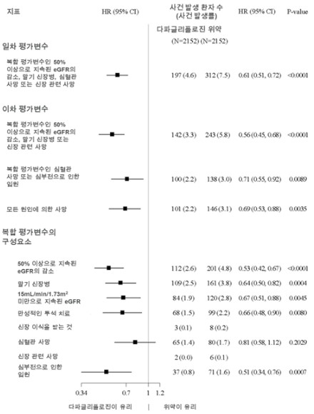 일차 복합 평가변수의 4가지 구성요소 모두 이러한 치료 효과에 개별적으로 기여하였다(그림 7). 다파글리플로진은 복합 평가변수인 50% 이상으로 지속된 eGFR의 감소, ESKD 또는 신장 관련 사망(HR 0.56[95% CI 0.45, 0.68], p<0.0001), 복합 평가변수인 CV 사망 및 심부전으로 인한 입원(HR 0.71[95% CI 0.55, 0.92], p=0.0089), 그리고 모든 원인에 의한 사망(HR 0.69[95% CI 0.53, 0.88], p=0.0035)의 발생률도 낮추었다.