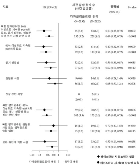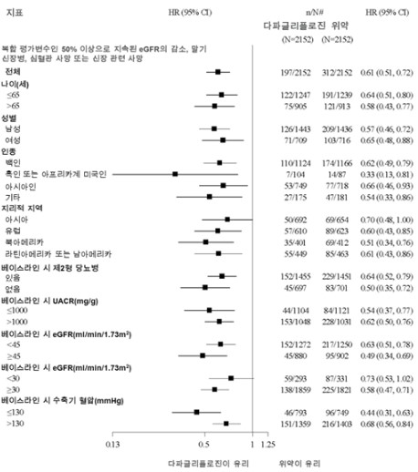 다파글리플로진의 치료 효과는 제2형 당뇨병이 있는 만성 신장병 환자 및 당뇨병이 없는 만성 신장병 환자에서 일관되었다(그림 8).