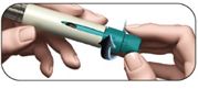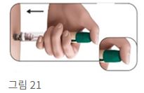 5.2 용량 조절 다이얼의 중앙에 엄지 손가락을 놓는다. 천천히 다이얼을 최대한 누르고, 완전히 주사가 끝날 때까지 잡는다 (그림 21).