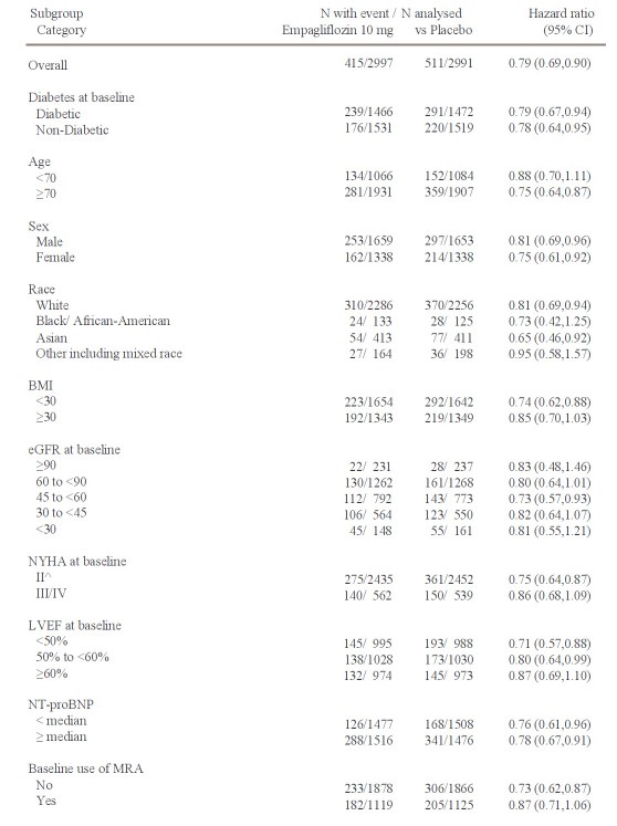 이 약 10mg은 일차 복합 평가변수인 심혈관계 질환 사망 또는 심부전으로 인한 입원 위험을 감소시키는 데 있어 위약에 비해 우월했다. 추가적으로, 엠파글리플로진은 HHF (최초 및 재입원) 발생 위험을 유의하게 감소시켰다 (표 13 참조).