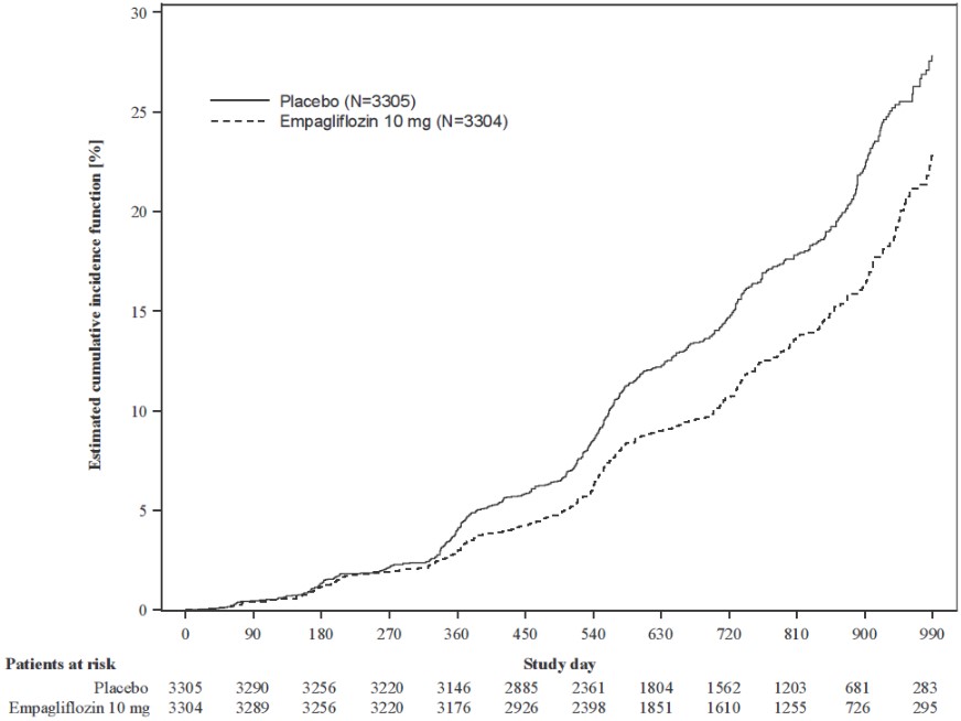 총 3,304명의 환자가 엠파글리플로진 10 mg 군에 무작위 배정되었고(위약: 3,305명), 중앙값 24.3개월 동안 추적 관찰되었다. 시험 집단은 평균 연령이 63.3세(범위: 18‑94세)인 남성 66.8%과 여성 33.2%으로 구성되었고, 23.0%가 75세 이상이었다. 시험 집단의 58.4%가 백인, 36.2%가 아시아인 그리고 4.0%가 흑인/아프리카계 미국인이었다.