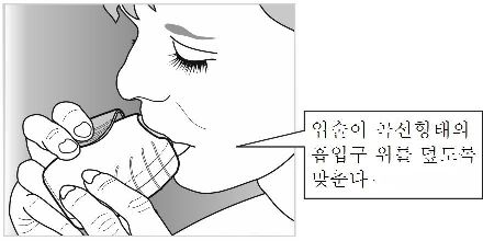 ② 흡입구를 입술 사이에 대고 입술을 꽉 다문다. 사용 시 공기구멍을 손가락으로 막지 않는다.