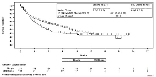 이 약의 안전성 및 유효성은 일차 재발 소아 B세포 급성 림프모구 백혈병(B‑ALL)이 있는 소아 및 젊은 성인 환자(≧ 만 1세~< 만 31세)를 대상으로 한 위험도 층화, 무작위배정, 제3상, 공개 라벨 임상시험에서 평가했다. 등록된 환자는 재유도 화학요법을 투여받았고, 투여 완료 시 고위험(HR), 중간 위험(IR), 저위험(LR) 재발 또는 치료 실패로 위험도가 평가되었다. 위험도 층화는 재발 부위, 재발까지의 시간, 재유도 요법 종료 골수 형태 및 MRD 수준을 기준으로 했다. 일차 평가변수는 무질병 생존(disease‑free survival, DFS)이었다. 이 약은 15 μg/m2/일 용량으로 연속적인 정맥 주입을 통해 투여되었다. 이 약의 각 주기는 5주 동안 지속되었다(28일간의 연속적인 정맥 주입 후 7일간의 휴약).