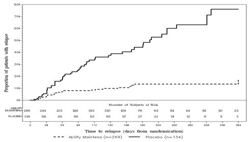 조현병의 증상 조절 유지에서 이 약의 유효성은 조현병의 DSM‑IV‑TR 기준을 만족하며 최소 1개의 항정신병 약물로 치료받는 환자를 대상으로 한 이중 맹검, 위약 대비, 무작위 중단 시험을 통해 확립되었다. 환자들은 최소 3년의 질병 이력 및 항정신병 치료를 받지 않을 때 재발(relapse) 또는 증상 악화의 이력을 가지고 있었다.