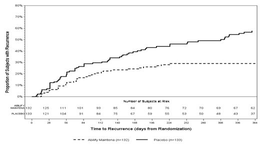 사전 계획된 중간 분석 결과 위약 투여군 대비 이 약 투여군으로 무작위 배정된 환자에서 재발(relapse)까지의 시간이 통계적으로 유의하게 긴 것으로 입증되었으며, 시험은 유효성 유지가 증명되어 이후 조기 종료되었다. 최종 분석 결과 위약 투여군 대비 이 약 투여 군으로 배정된 환자에서 재발(relapse)까지의 시간이 통계적으로 유의하게 긴 것으로 입증되었다(그림 1).