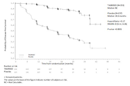 2 연구자 평가에 의한 ORR 및 DoR 결과는 눈가림된 독립적 중앙 검토(Blinded Independent Central Review, BICR)를 통해 보고된 것과 일치한다; BICR 평가에 의한 ORR은 오시머티닙 치료 시 64.9% [95% CI: 59.0, 70.5], 항암화학요법제 치료 시 34.3% [95% CI: 26.5, 42.8]였다. ; BICR에 의한 DoR은 오시머티닙 치료 시 11.2개월(95% CI: 8.3, NC), 항암화학요법제 치료 시 3.1 개월(95% CI: 2.9, 4.3)이었다.