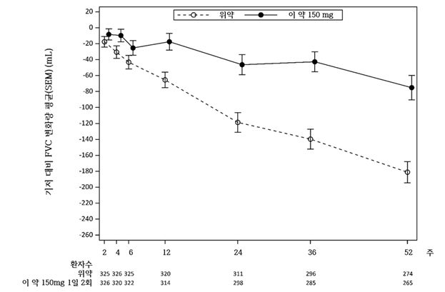 52주 간 FVC 연간 감소율(mL) 은 위약 대비 이 약 투여군에서 41.0mL 더 유의하게 감소하였고(표4. 참조) 이는 43.8%의 상대 치료 효과에 해당한다.