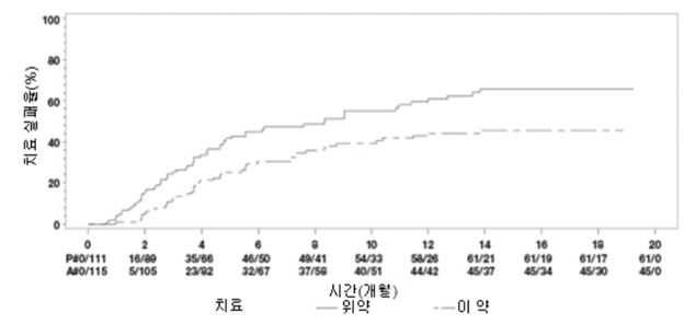 임상적 관해 및 임상 반응(PCDAI 점수가 베이스라인으로부터 최소 15점 감소되는 것으로 정의) 비율은 표 27에 제시한다. 코르티코스테로이드 또는 면역조절제의 중단율은 표 28에 제시한다.