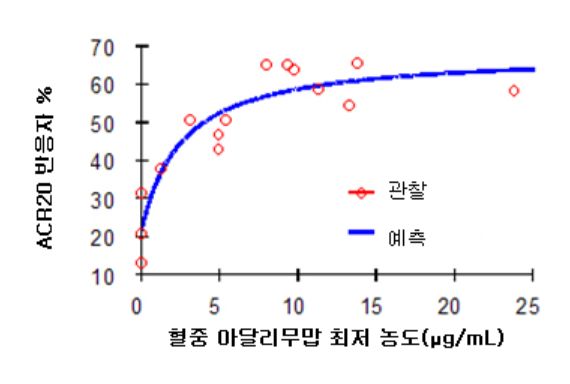 항 ‑아달리무맙 항체의 형성은 아달리무맙의 청소율 증가 및 효능 감소와 관련된다. 항 ‑아달리무맙 항체의 존재와 이상반응 사이의 상관관계는 명백하지 않다.