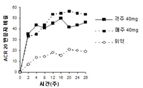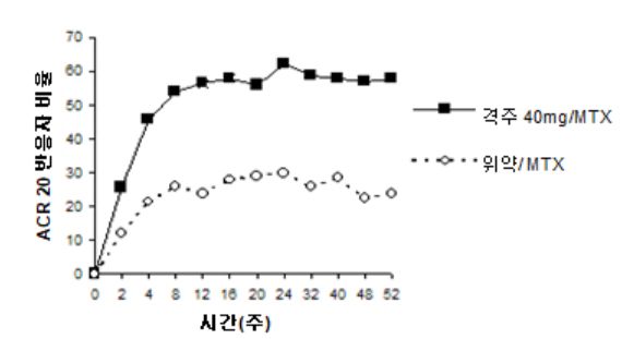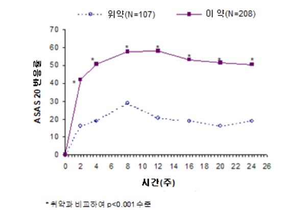 환자는 격주 0.8 mg/kg(최대 40mg) 이 약, 격주 0.4 mg/kg(최대 20mg) 이 약, 또는 매주 0.1 ‑0.4 mg/kg(최대 25mg) 메토트렉세이트를 투여 받았다. 16주차에 이 약 0.8 mg/kg 투여군에 무작위 배정된 환자가 MTX에 무작위 배정된 환자보다 더 많은 수에서 호의적인 유효성 반응(예: PASI 75)을 보였다.