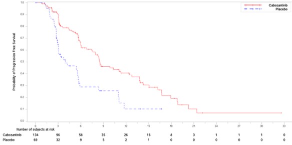 5 추적기간 중앙값 8.9개월 연구에 포함된 첫 100명(CABOMETYX 투여 환자 67명, 위약 투여 환자 33명)환자를 기준으로 한다. ORR에서 통계적으로 유의한 개선은 관찰되지 않았다.