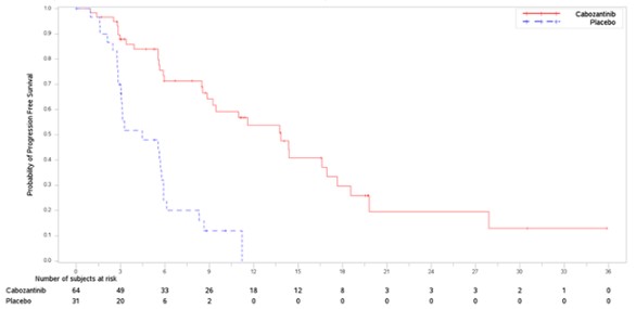 환자는 질병 진행, 허용할 수 없는 독성 또는 동의 철회가 있을 때까지 눈가림 연구 치료를 계속하였다. 위약으로 무작위 배정된 적격 환자는 실시간 중앙 검토를 통해 진행성 질병이 확인되면 공개 라벨 카보잔티닙으로 교차할 수 있었다. 1차 유효성 결과 측정은 BIRC가 고형 종양의 반응 평가 기준(RECIST) 1.1을 사용하여 평가한 ITT 집단의 무진행 생존율(PFS)이었고, 무작위 배정 시 층화 인자는 다음과 같다.