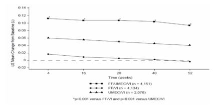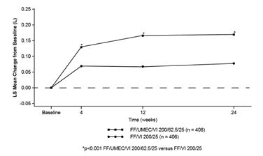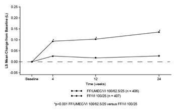 제24주차에서 최저 FEV<SUB>1</SUB>의 기준치 대비 변화(1차 유효성 평가변수)는 이 약 100/62.5/25 ㎍ 및 200/62.5/25 ㎍ 모두에서 각각 플루티카손푸로에이트/빌란테롤 100/25 ㎍ 및 200/25 ㎍에 비해 통계적으로 유의한 폐기능 개선을 나타냈다.