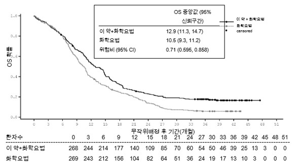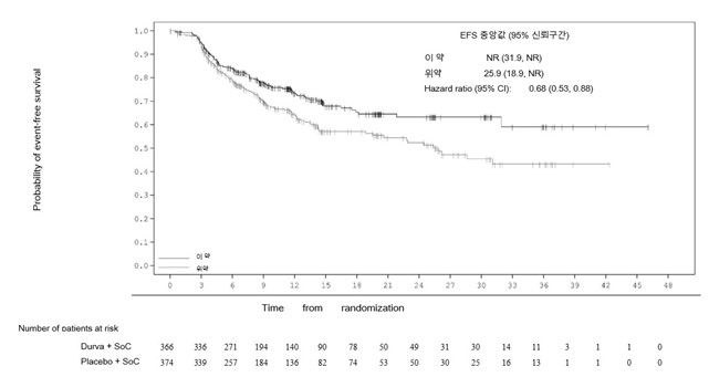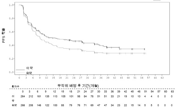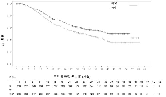 사전 지정된 중간 분석에서 이 연구는 화학요법 군과 비교했을 때 이 약 + 화학요법 군에서 EFS가 통계적으로 유의하고 임상적으로 의미 있게 개선되었음을 입증했다[HR = 0.68(95% CI: 0.56, 0.82), p = <0.0001]. 이 연구는 또한 화학요법군과 비교했을 때 이 약 + 화학요법 군에서 OS가 통계적으로 유의하고 임상적으로 의미 있게 개선되었음을 입증했다[HR=0.75(95% CI: 0.59, 0.93), p=0.0106]. 이 약 + 화학요법 군[반응률 = 37.3%(95% CI: 33.2, 41.6)] 에서 화학요법 군[반응률 = 27.5%(95% CI: 23.8, 31.6)] 대비 pCR 비율이 수치적으로 개선된 것으로 관찰되었다. 표 20, 그림 13 및 14 참조.