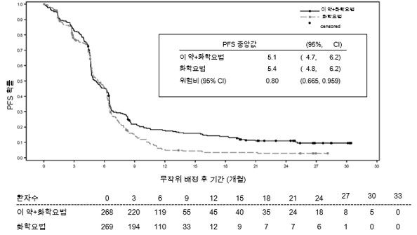 환자들은 수술 전 후 요법에 수술전 보조요법으로 이 약과 화학요법 병용요법을 투여(제 1군) 또는 수술전 보조요법으로 화학요법만 투여(제 2군)되도록 아래와 같이 1:1로 무작위 배정되었다.