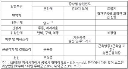 | * 보고된 이상반응 중 연구자가 약물과의 관련성이 의심되거나, 관련성이 많거나, 관련성이 명백한 것으로 판단한 이상반응 |
