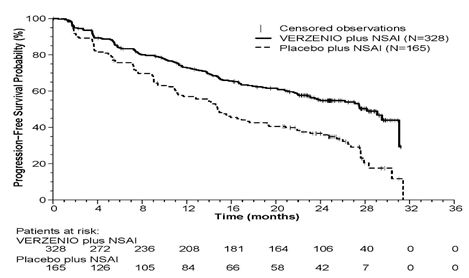 MONARCH 2 시험의 유효성 결과는 표 9, 그림 3, 그리고 그림4에 요약되어 있다. 눈가림 된 독립적 방사선 검토에 근거한 PFS평가는 연구자의 평가와 일치하였다.
