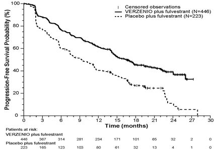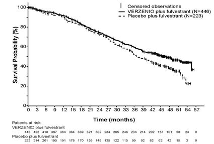 MONARCH 3은 HR‑양성, HER2‑음성의 진행성 또는 전이성 유방암이 있는 폐경 후 여성에 대한 일차 내분비 기반 요법으로서 비스테로이드성 아로마타제 억제제와 병용한 무작위 배정(2:1), 이중 눈가림, 위약 대조, 다기관 시험으로 이전에 유방암에 대한 전신 요법 치료 경험이 없는 환자들을 포함하였다.