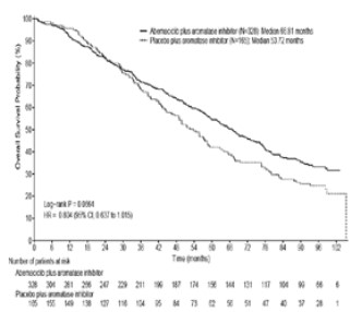 베이스라인 시점에 내장 전이가 있는 시험대상자 하위군에서 전체 생존의 최종 분석 결과 위험비는 0.758 (95% CI: 0.558, 1.030), OS 중앙값은 이 약과 아나스트로졸 또는 레트로졸 병용 요법에서 63.72 개월, 위약과 아나스트로졸 또는 레트로졸 병용 요법에서 48.82 개월로, 통계적으로 유의한 차이는 관찰되지 않았다.