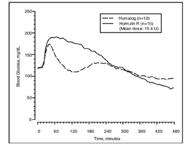 정맥 투여된 이 약의 혈당 감소 효과는 제 1형 당뇨병 환자 21명에서 평가되었다. 이 시험에서, 환자의 통상적 인슐린 용량은 유지되었고, 혈당 수치는 1~3시간의 도입기(run-in phase)에 200~260 mg/dL의 안정적 범위에 도달하도록 허용되었다. 도입기 후 6시간의 평가 기간을 두었다. 평가 기간에, 환자들은 0.5 U/hr의 초기 주입 속도로 이 약을 정맥 투여 받았다. 이 약의 주입 속도는 혈당 수치가 100~160 mg/dL에 도달하여 유지될 수 있도록 정기적인 시간간격으로 조절할 수 있었다.