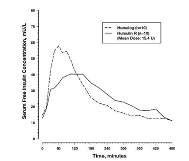 건강한 지원자 및 당뇨 환자에 대한 시험 결과, 이 약은 regular 휴먼인슐린에 비해 더 신속하게 흡수되었다. 0.1~0.4 U/kg으로 이 약을 피하 투여 받은 건강한 지원자들에서, 최고 혈청 농도는 투여 후 30~90분에 확인되었다. 제 1형 당뇨병 환자에서도 유사한 결과가 확인되었다(그림 2 참고).