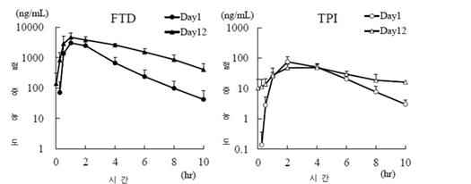 중등증의 신장애 환자(CLcr 30 ~ 59 mL/min)는 Grade 3 이상의 중증을 포함한 이상반응이 경증의 신장애 환자 또는 정상 신기능 환자에서 보다 높게 발생하였다. 또한 정상(CLcr ≧ 90 mL/min) 신기능 환자 또는 경증(CLcr = 60 ~ 89 mL/min)의 신장애 환자와 비교하여 중등증의 신장애 환자에서 트리플루딘 및 티피라실염산염이 더 많이 노출되었다.
