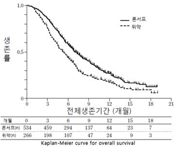 전체 생존기간(1차 유효성 평가변수) 중간값은 론서프정 치료군에서 7.8개월(95% CI[7.1‑8.8])이었고 위약 치료군에서 7.1개월(95% CI[5.9‑8.2])이었다(위험 비는 0.79, 95% CI[0.62‑0.99]). 론서프정 치료군에서 위약 치료군보다 임상적으로 의미 있고 통계적으로 유의한 생존 이점을 증명했다(P=0.035, stratified log‑rank test). 모든 하위 집단 분석에서 일반적으로, 론서프정으로 치료 시 사망 위험이 감소하는 경향을 보였다. 론서프정을 투여 받은 환자군의 생존기간이 위약군 대비 통계적으로 유의하게 연장됐다. 전체생존기간(overall survival)은 다음과 같다.