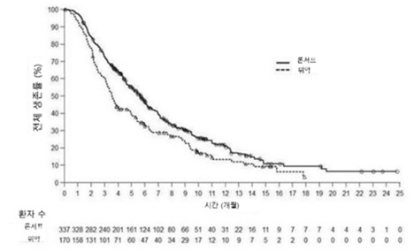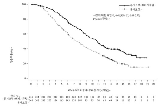 론서프정과 베바시주맙을 병용요법으로 치료한 결과, 론서프정 단독요법 치료에 비해 OS 및 PFS가 통계적으로 유의하게 개선되었다.