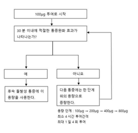 1) 이 약은 현재 지속성 통증에 대한 마약성 진통제 치료를 받고 있으며, 이에 대한 내약성을 가진 암 환자의 돌발성 통증에 사용하는 제제이다. 마약성 진통제 약물에 내약성이 있는 환자는 적어도 모르핀 60 ㎎/일, 경피형 펜타닐 25 ㎍/시간, 옥시코돈 30 ㎎/일, 하이드로모르폰 경구제제 8 ㎎/일을 1주일 이상의 동등 진통 용량의 다른 마약성 진통제 를 복용하고 있는 환자이다.