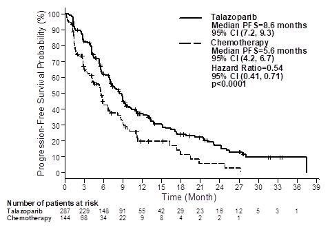 이 시험에서 무진행생존기간(일차 유효성 평가변수)은 이 약 투여군에서 화학요법군에 비해 통계적으로 유의미한 개선을 나타냈다. 최종 전체생존기간(OS) 분석에서 통계적으로 유의한 OS에 대한 영향은 없었다. 독립적 평가 및 연구자가 평가한 1차 분석에 따른 EMBRACA 시험의 유효성 자료는 표 7에 요약되어 있다. 무진행생존기간 및 전체생존기간의 Kaplan ‑Meier 곡선은 그림 1 및 그림 3에 나와있다.