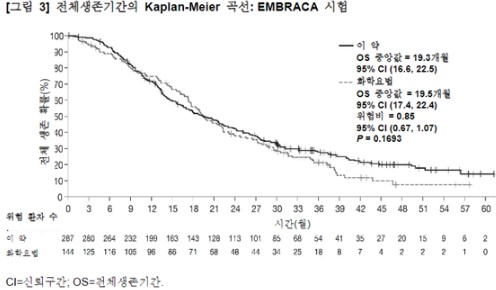 b. 최종 OS 분석 시점에 이 약 투여군 및 화학요법군에서 무작위 배정된 환자의 각각 46.3%와 41.7%가 이후에 백금요법을 받았으며, 4.5%와 32.6%는 이후에 PARP 억제제를 투여받았다.
