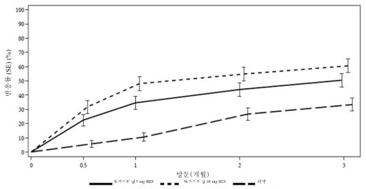 임상적 반응의 유지는 위약군 중 20%에서 관찰된 반면, 이 약 5 mg 1일 2회 투여군의 52%, 이 약 10 mg 1일 2회 투여군의 62%에서 관찰되었다.
