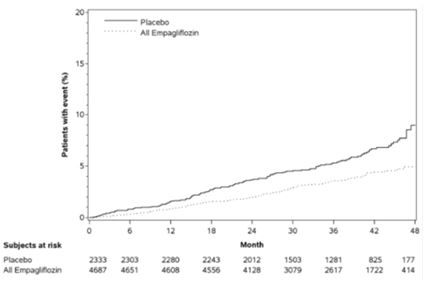 또한 현성알부민뇨가 있는 환자에서 지속적인 정상알부민뇨 또는 미세알부민뇨로의 전환은 위약대비 엠파글리플로진에서 더 높게 나타났다. (엠파글리플로진 49.7%, 위약 28.8%, 위험비(HR) 1.82, 95 % CI 1.40, 2.37).