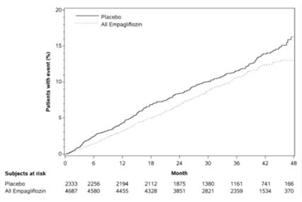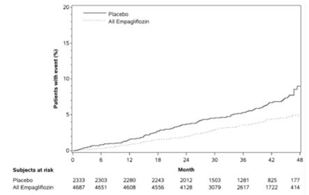 EMPA‑REG OUTCOME 시험에서 엠파글리플로진은 위약과 비교하였을 때 심부전으로 인한 입원의 위험을 감소시켰다 (엠파글리플로진 2.7 %; 위약 4.1 %; 위험비(HR) 0.65, 95 % CI 0.50, 0.85).