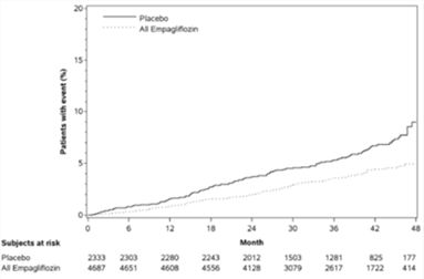 EMPA‑REG OUTCOME 시험에서 엠파글리플로진은 위약과 비교하였을 때 심부전으로 인한 입원의 위험을 감소시켰다 (엠파글리플로진 2.7 %; 위약 4.1 %; 위험비(HR) 0.65, 95 % CI 0.50, 0.85).