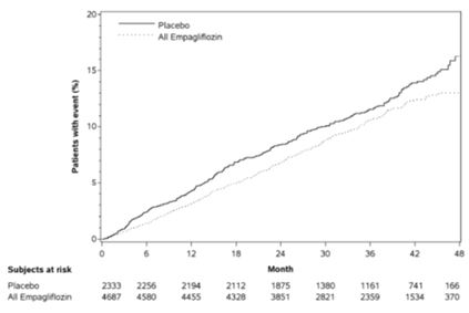 EMPA ‑REG OUTCOME 시험에서 엠파글리플로진은 위약과 비교하였을 때 심부전으로 인한 입원의 위험을 감소시켰다 (엠파글리플로진 2.7 %; 위약 4.1 %; 위험비(HR) 0.65, 95 % CI 0.50, 0.85).