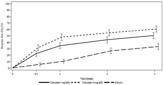 PsA-I 시험에서 제3개월 시점에 HAQ-DI 반응자 비율(반응은 베이스라인 대비 0.35 이상의 향상을 보인 경우로 정의됨)은 이 약 5 mg 1일 2회 투여에서 53%였고 이 약 10 mg 1일 2회 투여에서 55%였으며 위약군에서 31%였다. PsA-II 시험에서도 유사한 반응이 관찰되었다.