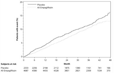 ⓡ 임상연구에 심혈관계 고위험군 환자 7,020명이 이 약 10 mg/일(n=2,345명), 이 약 25 mg/일(n=2,342) 또는 위약 (n=2,333)을 최대 4.5년동안 투여받았다. 이 연구에서 엠파글리플로진의 전반적인 안전성 프로파일은 이미 알려진 안전성 프로파일과 유사하였다.
