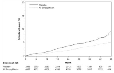 또한 현성알부민뇨가 있는 환자에서 지속적인 정상알부민뇨 또는 미세알부민뇨로의 전환은 위약대비 엠파글리플로진에서 더 높게 나타났다. (엠파글리플로진 49.7%, 위약 28.8%, 위험비(HR) 1.82, 95 % CI 1.40, 2.37).